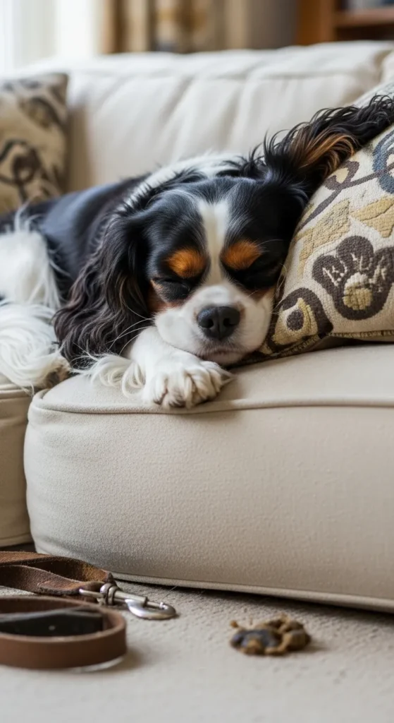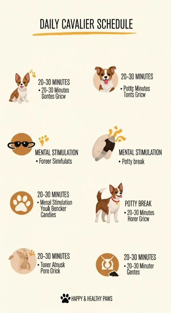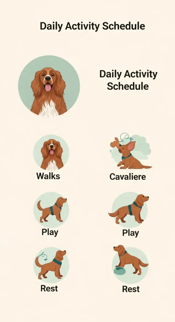 Cavaliers are men of uniform. Having regular timings of meals, walks, and bedtime would control their energy. Their play should be followed by rest zones where they can relax.