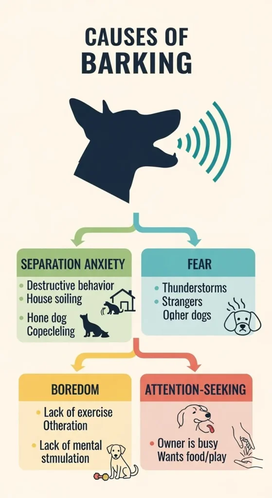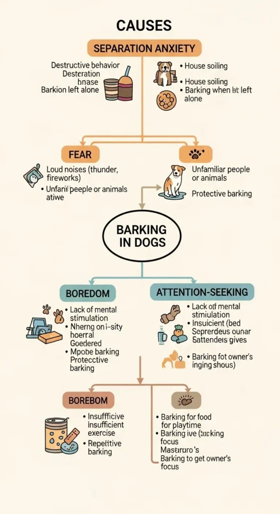 - Fear or Stress: Fearful barking can be brought about by loud sounds (such as thunderstorms) or by a change in routine.