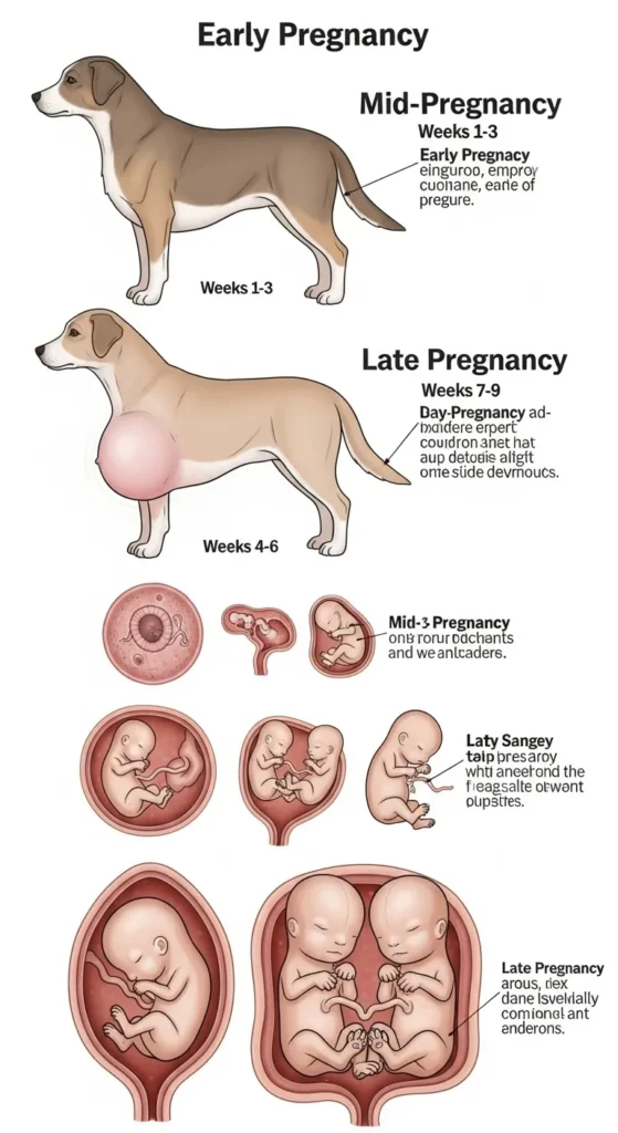 Dog pregnancy (synonymous with gestation) refers to the duration of time that a female dog (bitch) has developing puppies in her uterus. Canine pregnancy takes an average period of 63 days, although it can vary from 58 to 68 days based on the size of the breed and the number of pups in a litter.